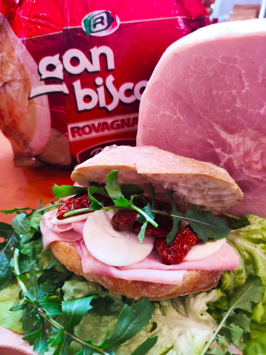 Ciabatta croccante di grano antico, prosciutto cotto Gran Biscotto, scamorza semipassita lavorata a Caciocavallo, pomodori secchi sott'olio e foglie di rucola.